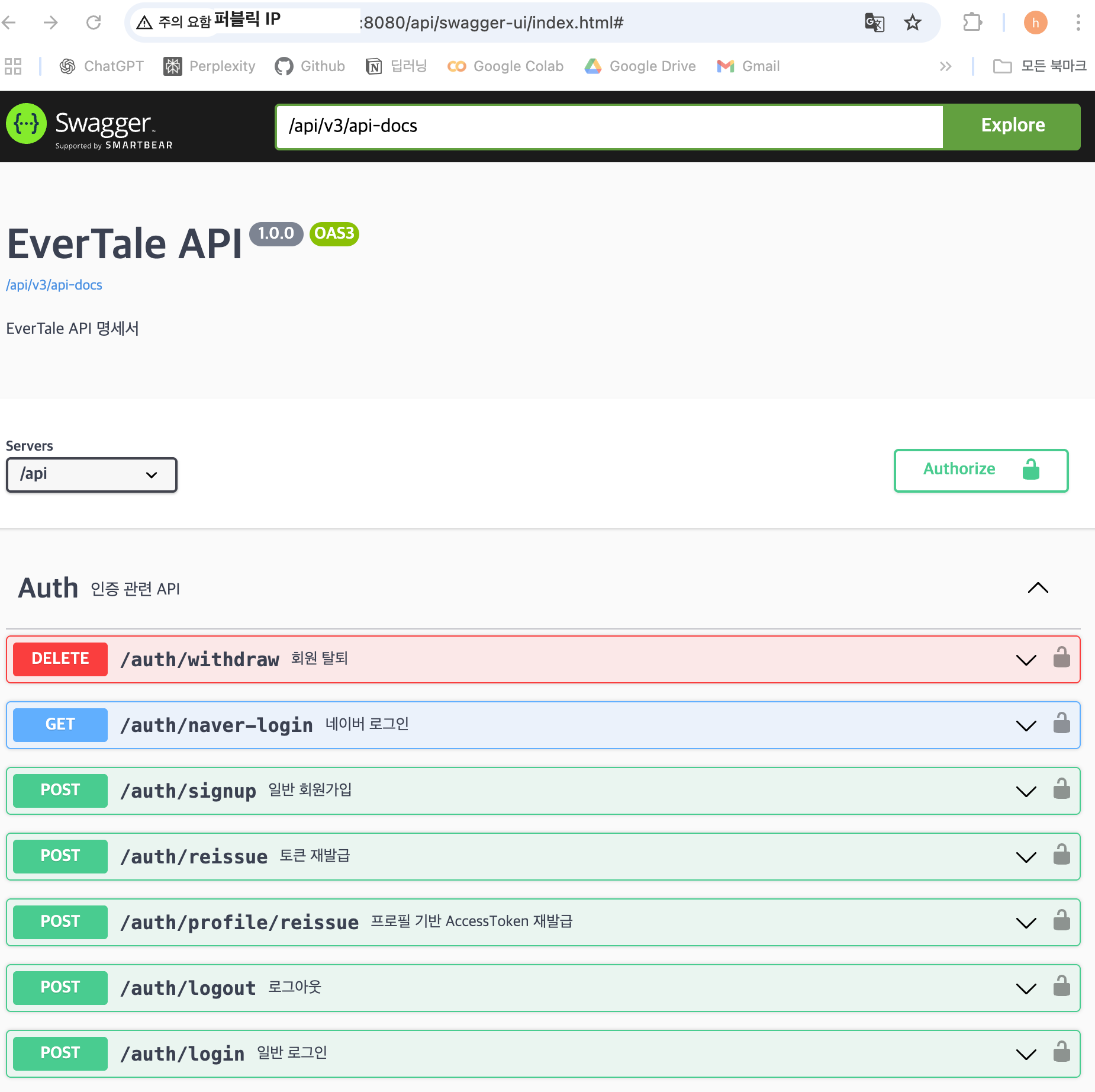 - EC2의 퍼블릭 IP:8080/api/swagger-ui/index.html# 을 입력하면 SpringBoot의 Swagger UI를 확인할 수 있습니다.