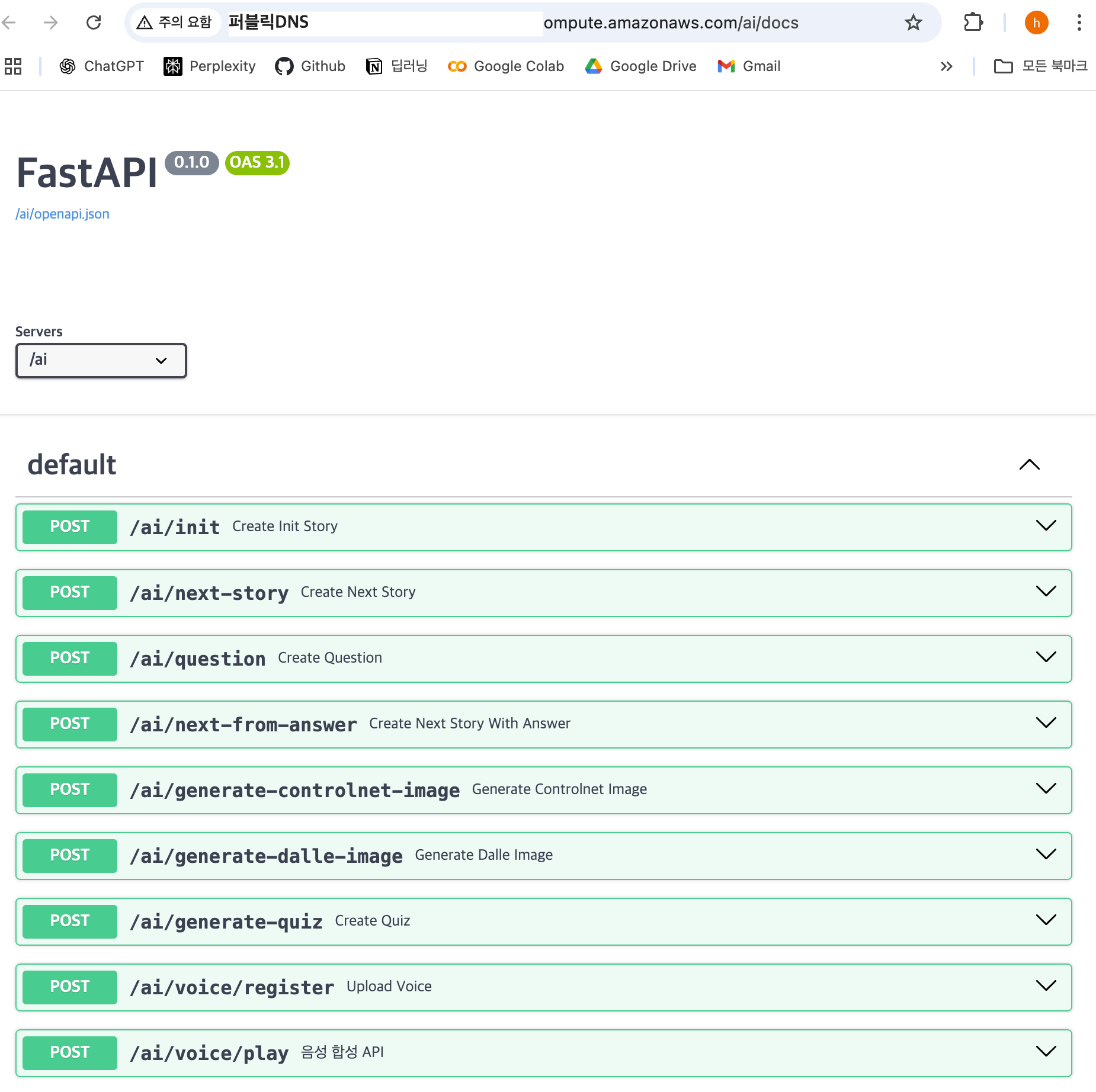 - 퍼블릭DNS/ai/docs를 입력하면 확인할 수 있습니다. (물론, 퍼플릭 IP를 통해서도 확인이 가능합니다.)