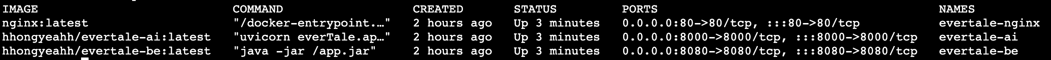 AI / BE / Nginx 컨테이너가 각각 Created Started 되었다는 로그를 확인할 수 있습니다.