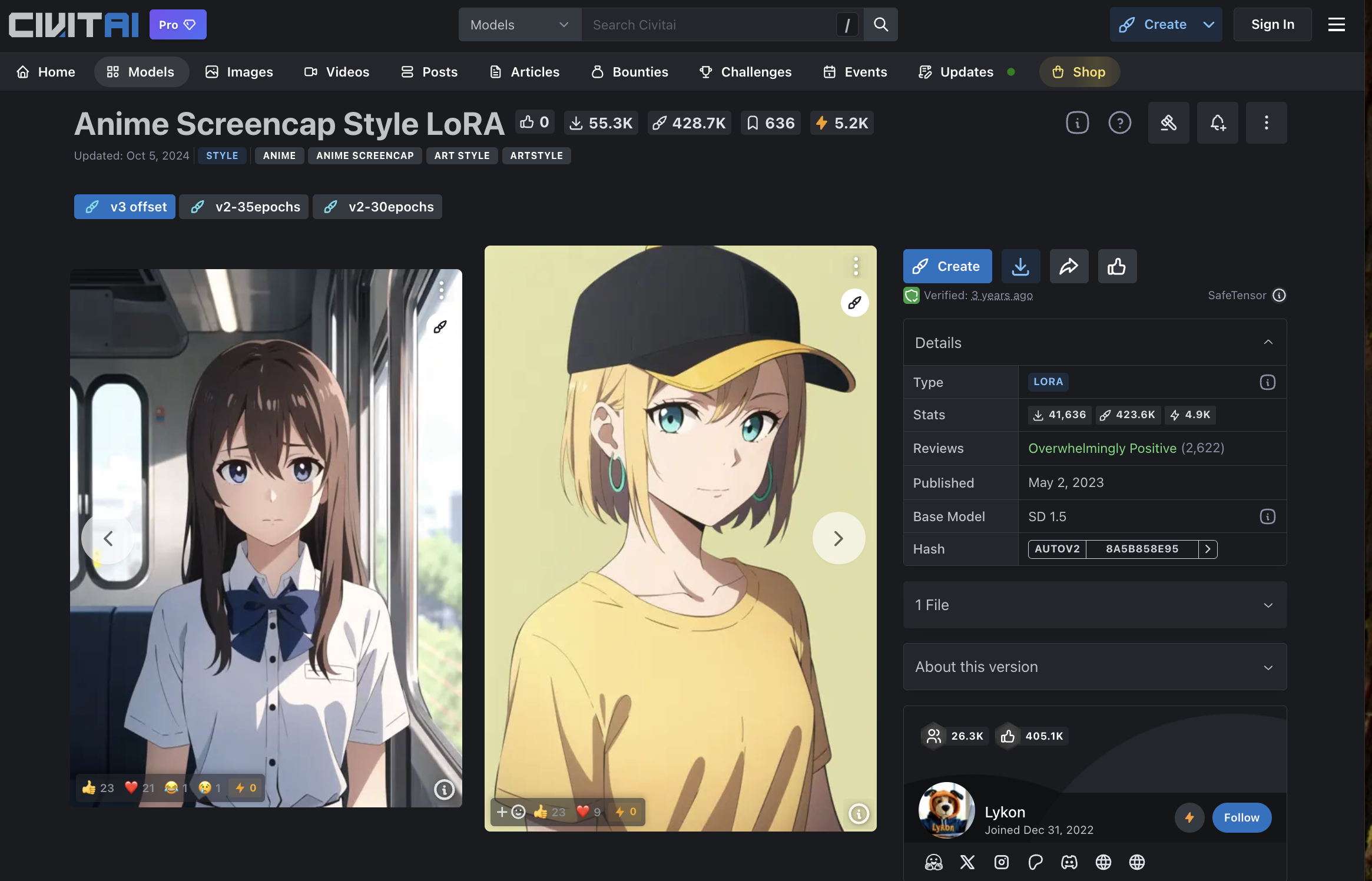 저는 아래의 anime-screencap-stype-lora 모델을 선택했습니다