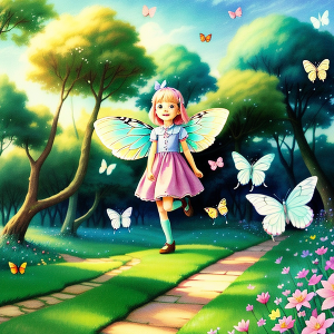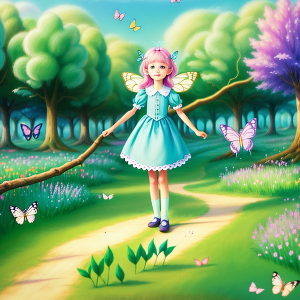 Diagonal path fairy, trees and grass, butterflies fluttering