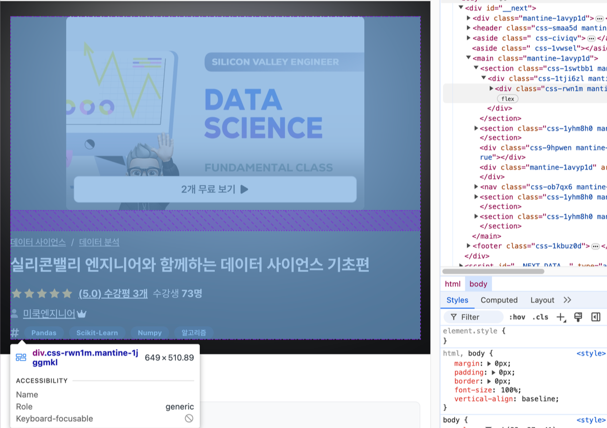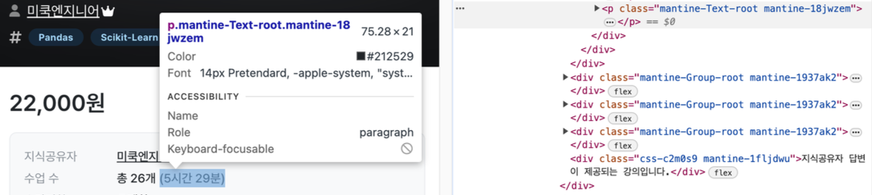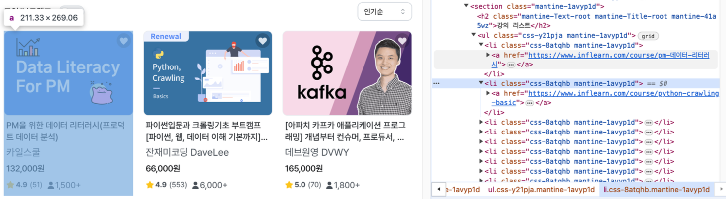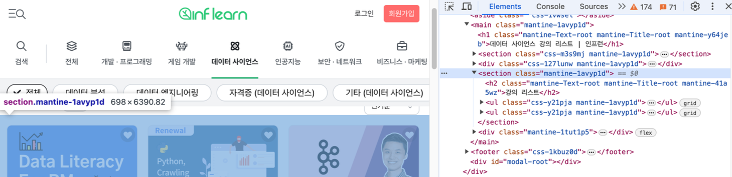 - 따라서, 보다 확실한 넓은 범위의 section 태그를 먼저 가져오고 거기에 속해있는 강의 리스트 a 태그들을 사용하여 크롤링하는 방식을 취한다.