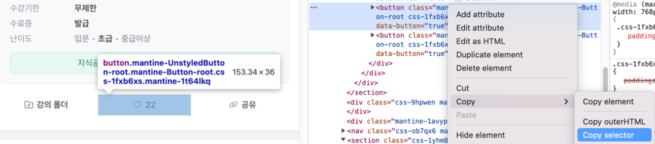 - copy selector : 딱 해당 element를 가져올 때 유용하다.