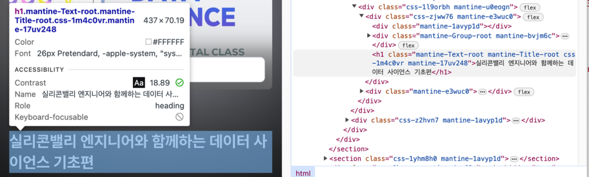 - 개발자 도구를 켜 제목위에 커서를 놓으니 매우 긴 태그 이름을 가진 것을 알 수 있습니다. 이 경우 “아 크롤링하기 빡세겠구나!”라는 뜻으로 받아들이면 됩니다.