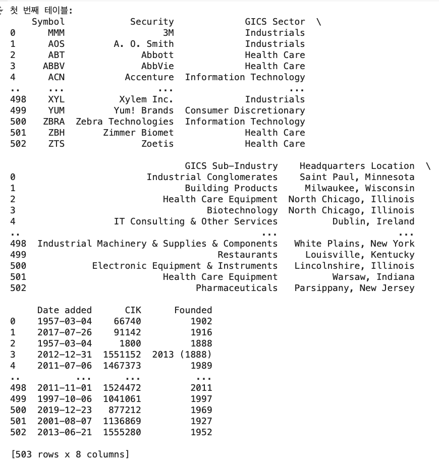 - tables[0]: 첫 번째 테이블을 선택 → S&P 500 기업 목록이 첫 번째 테이블에 있음