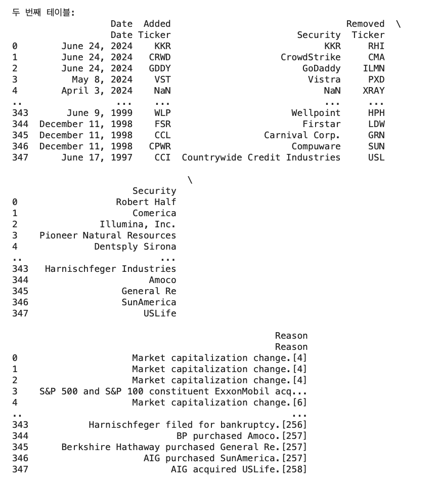 2. 두 번째 테이블 분석 : S&P 500 구성 요소의 변경 내역을 포함