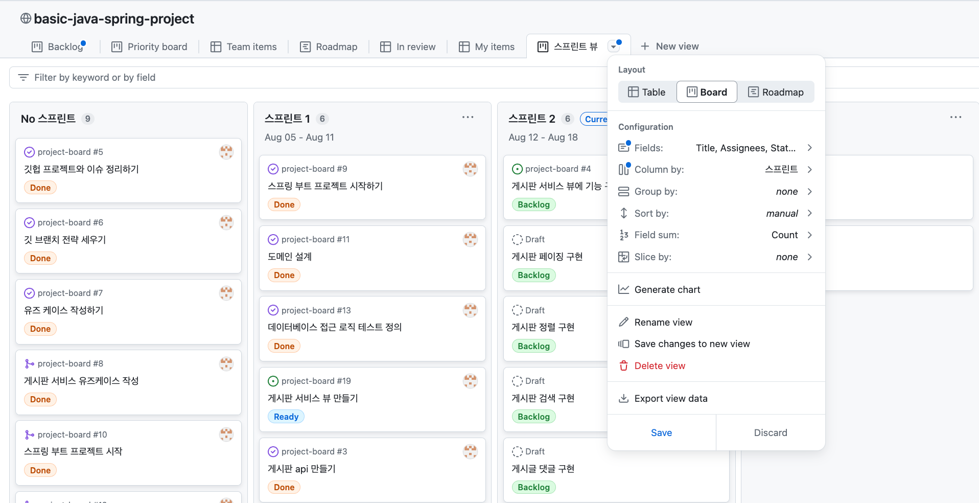 New view를 통해 별개의 스프린트 뷰를 만들고, Column by 를 설정에서 만들어준 스프린트로 설정하여, 가독성 높게 한번에 볼 수 있습니다.