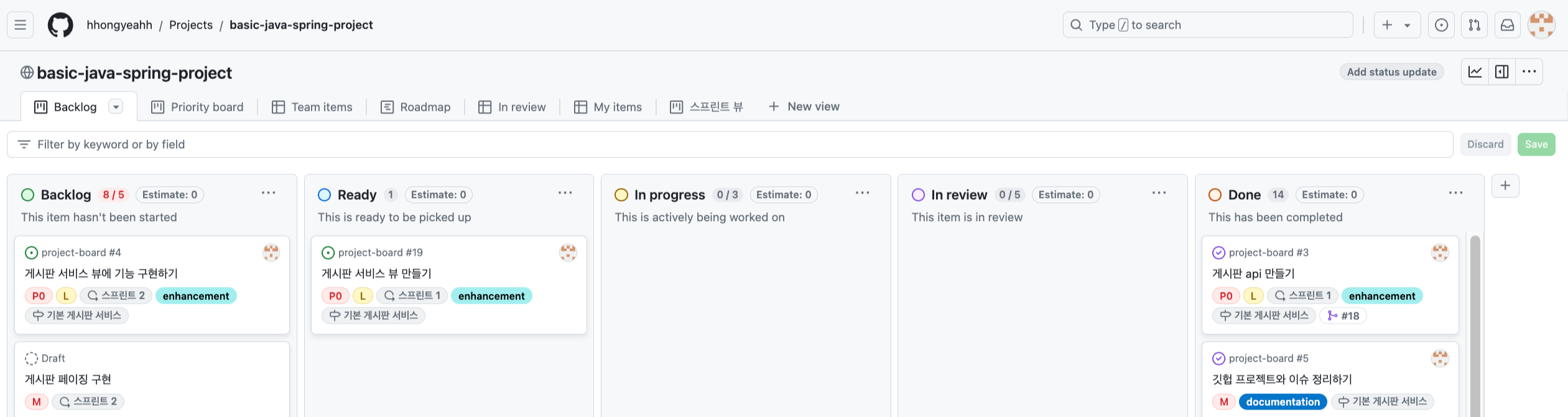 Kanban 스타일은 New - Backlog - Ready - In progress - In review - Done 의 Status를 초기화 상태에서 가지고 있습니다.
