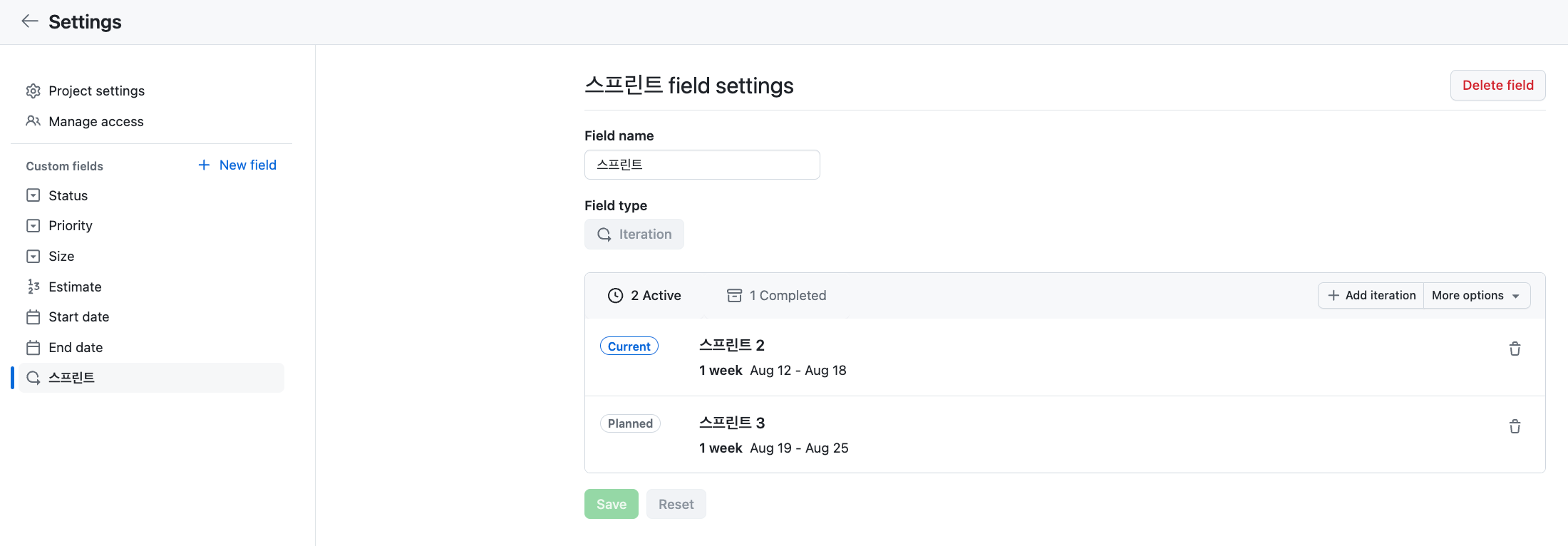 아래와 같이 스프린트 field settings이 나타남을 확인할 수 있습니다.