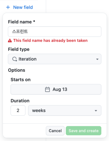 Field name을 설정한 후, Field Type를 Iteration으로 맞추고, 스프린트 시작일과 주기를 설정해 줍니다.