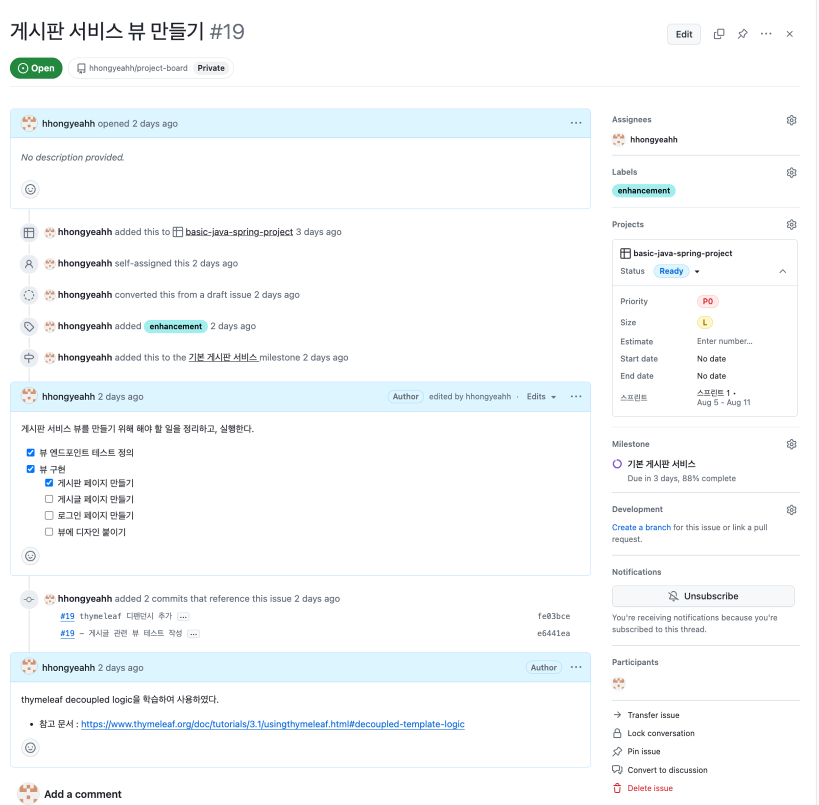 - Labels을 통해서 enhancement, document 등으로 설정할 수 있습니다. 보통 실제 코드 작성이 이루어지면, enhancement를 사용하고, 이외에 프로젝트에 필요한 문서작업을 수행하는 경우 document로 설정합니다.