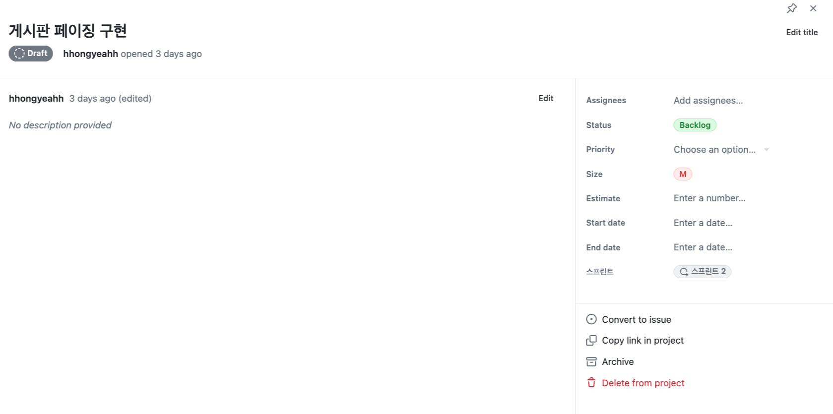 Convert to Issue 버튼을 눌러 Draft를 본격적으로 Open하고, 넘버(#)를 부여받습니다.