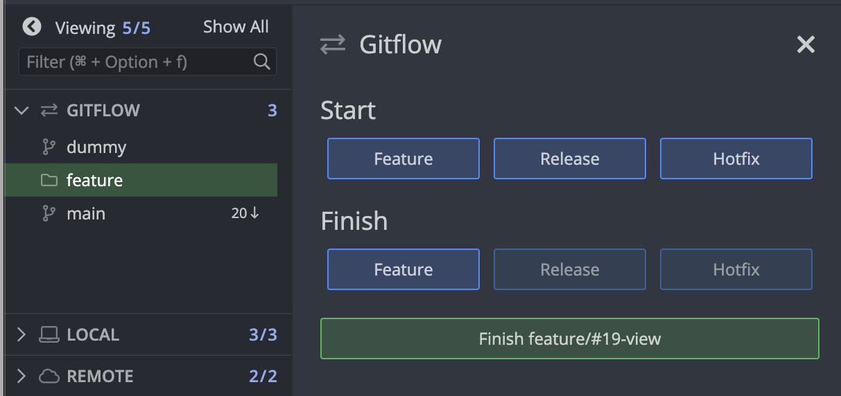 왼쪽 사이드 탭에 GitFlow위에 마우스를 갖다대면, + 버튼이 나오고 그것을 클릭한다.