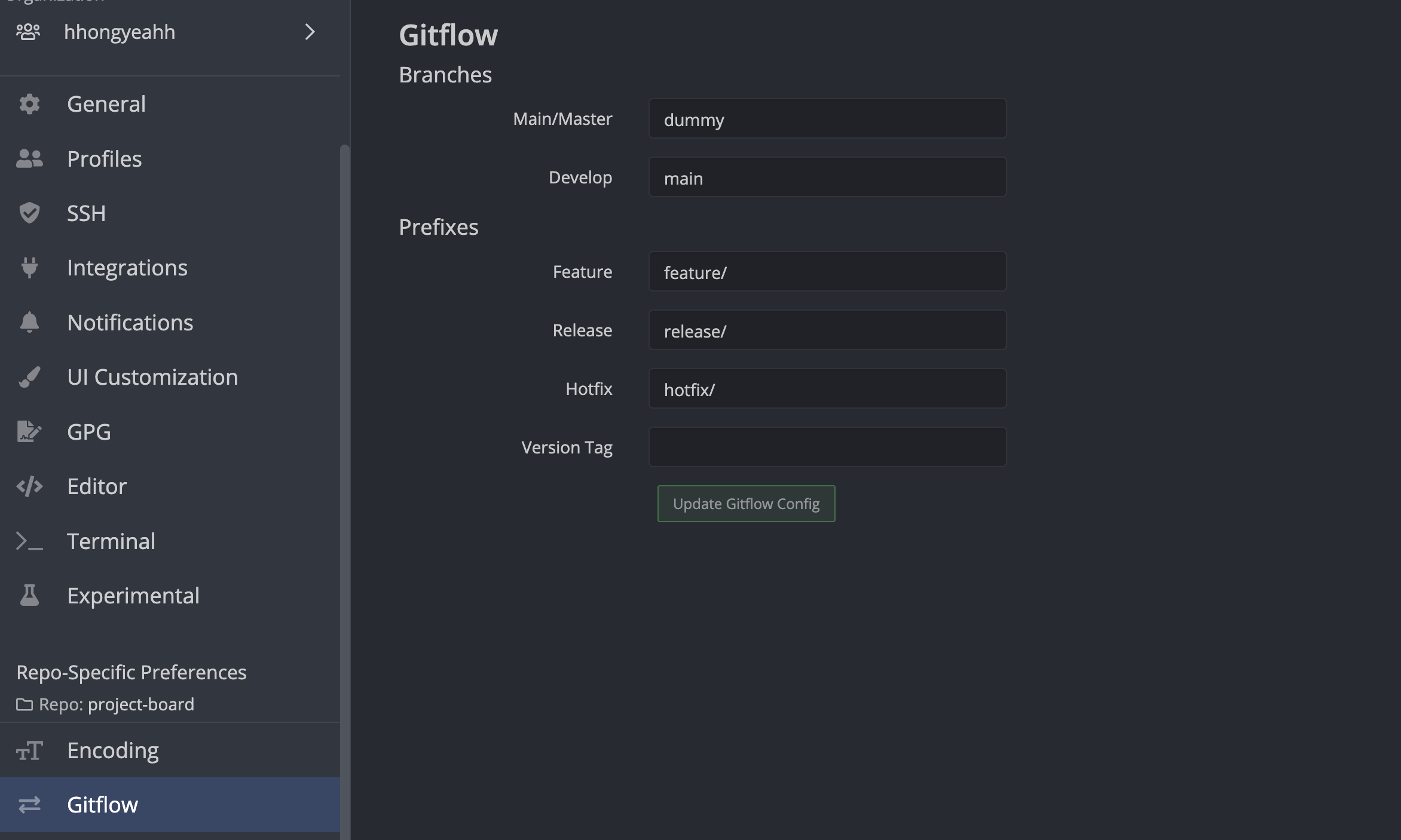Repo- specifie-preferences에서 Gitflow를 클릭하고, Main/Master를 dummy로 변경해 주고, Develope를 main으로 변경해 준다. 이후, Update Gitflow Config를 클릭한다.