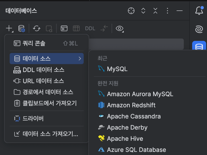 오른쪽 DB아이콘을 클릭하고, + 아이콘을 클릭한 후 지원하는 DB중 MYSQL을 선택한다.