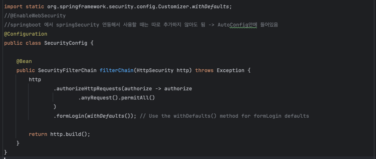 - SecurityConfig 클래스를 생성해 주고, filterChain 메소드를 @Bean 등록해 준다.