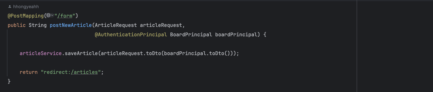 public String postNewArticle(ArticleRequest articleRequest, @AuthenticationPrincipal BoardPrincipal boardPrincipal) {