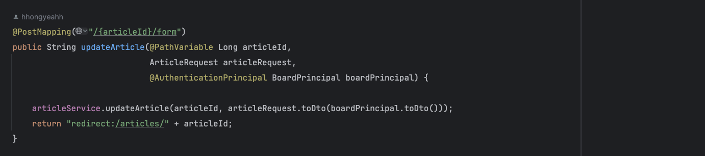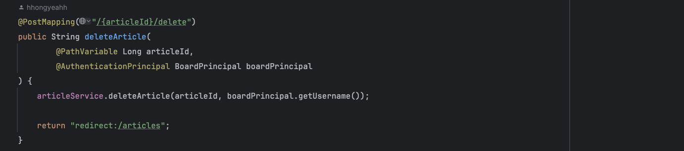 - "redirect:/articles": 이 문자열은 Spring MVC에서 리다이렉트를 나타냅니다. 사용자가 /articles 경로로 다시 이동하게 되며, 게시글 목록이 표시됩니다.