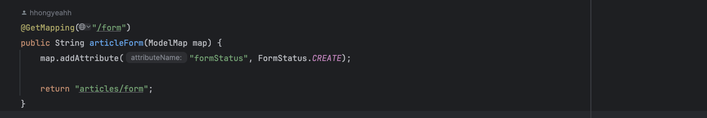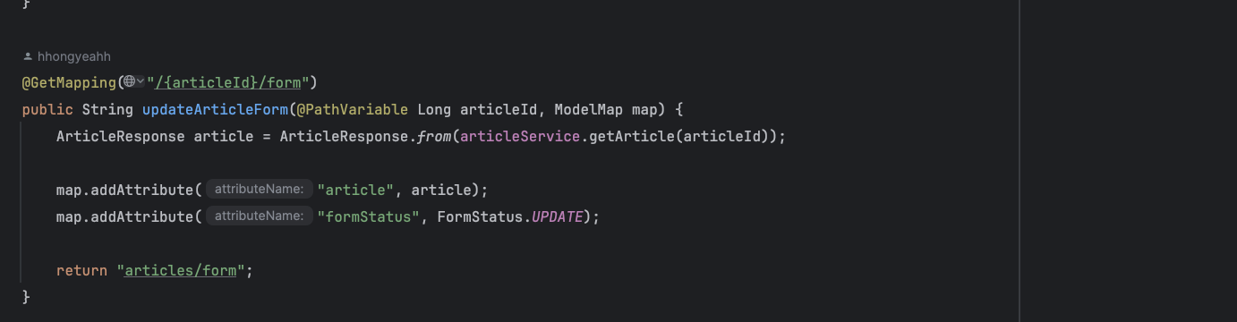 - @GetMapping("/{articleId}/form"): /articles/{articleId}/form으로 접속하면 호출됩니다.