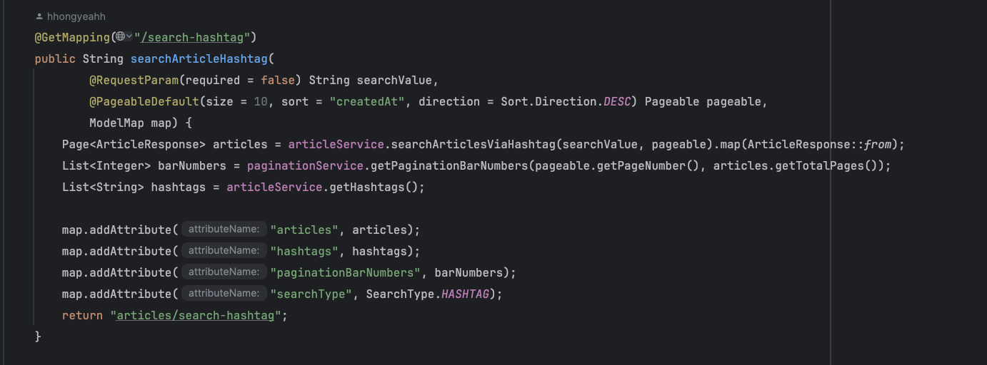 case HASHTAG -> articleRepository.findByHashtag("#" + searchKeyword, pageable).map(ArticleDto::from);//#자동삽입
