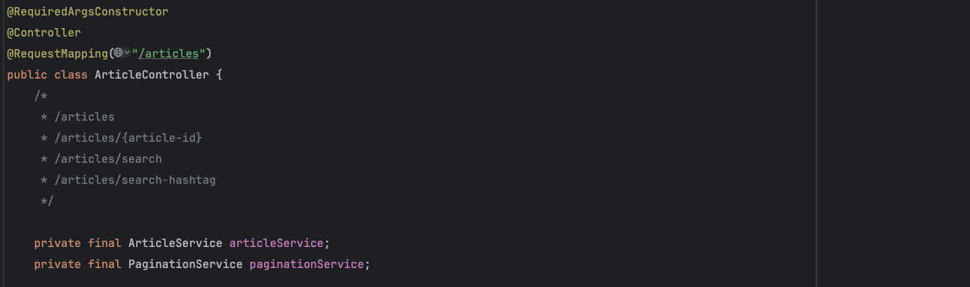- @RequiredArgsConstructor: final로 선언된 모든 필드를 매개변수로 갖는 생성자를 자동으로 생성해줍니다. 따라서 ArticleService와 PaginationService가 생성자 주입을 통해 주입됩니다.