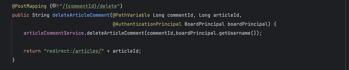 - public String deleteArticleComment(@PathVariable Long commentId, Long articleId): 이 메소드는 URL 경로 변수로부터 commentId를 받아오며, articleId는 요청 파라미터로 받아 댓글을 삭제한 후 리다이렉트할 게시글의 ID입니다.