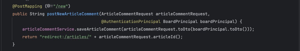 - 이 메소드는 클라이언트로부터 ArticleCommentRequest 객체를 받아 처리하며, 처리 후 리다이렉트할 URL을 반환합니다.