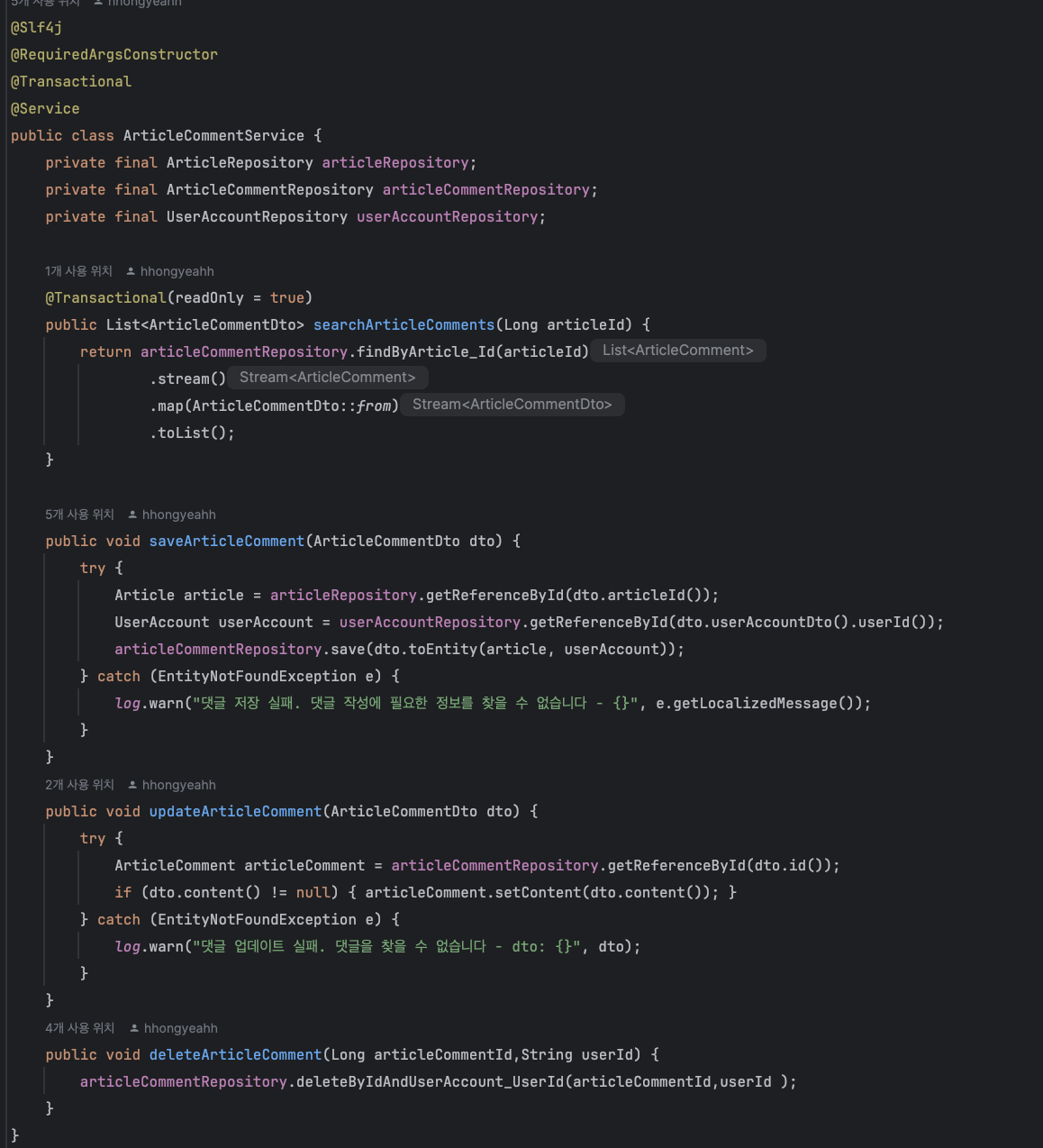 - articleCommentService.saveArticleComment(...): 이 메소드는 댓글 저장 비즈니스 로직을 수행합니다.