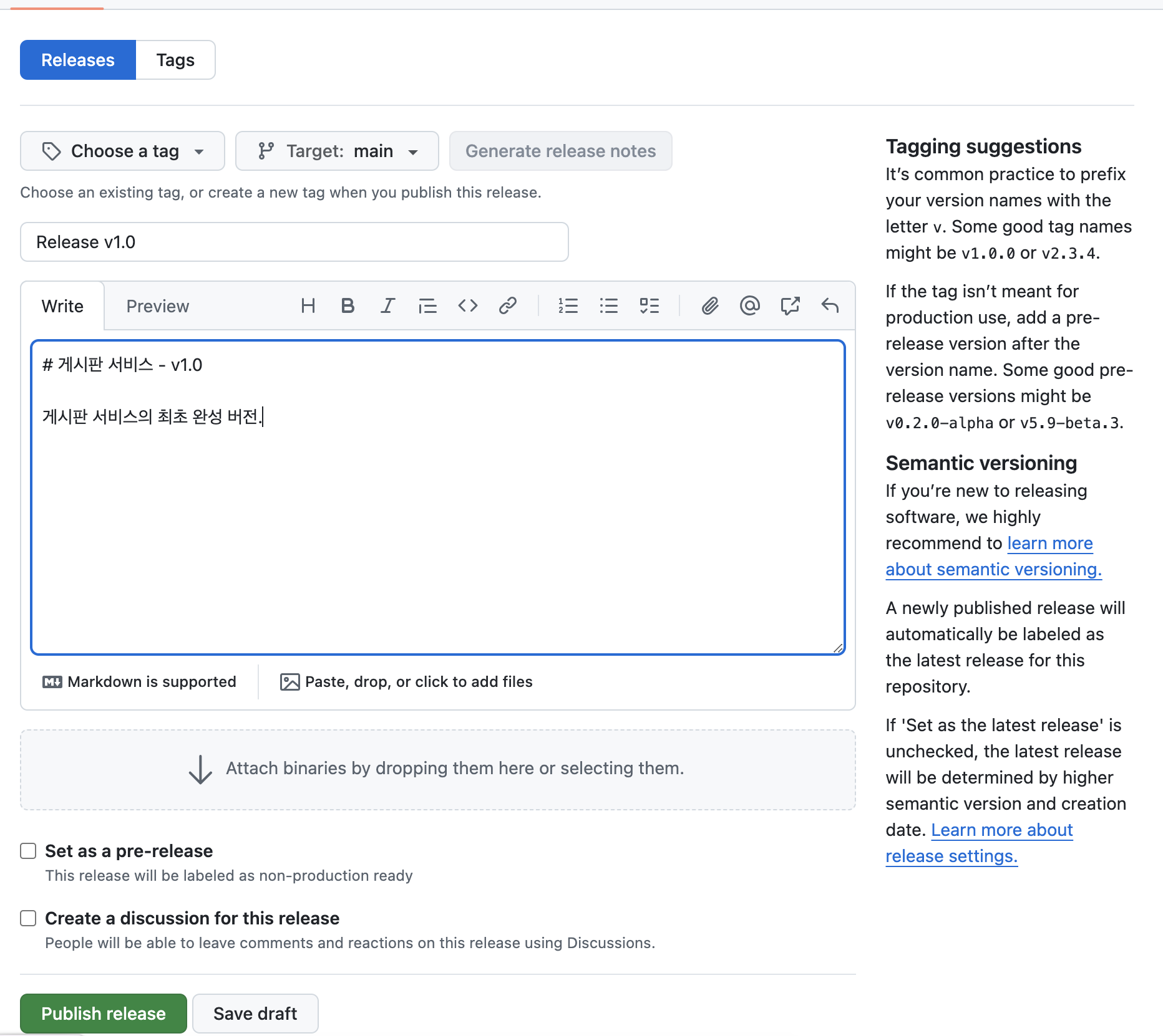 - Set as a pre-release : 완전히 릴리즈하는 것이 아니라 릴리즈 하기 전에 테스트 용으로 사용하는 것으로, 별도의 색깔과 모양으로 관리됨