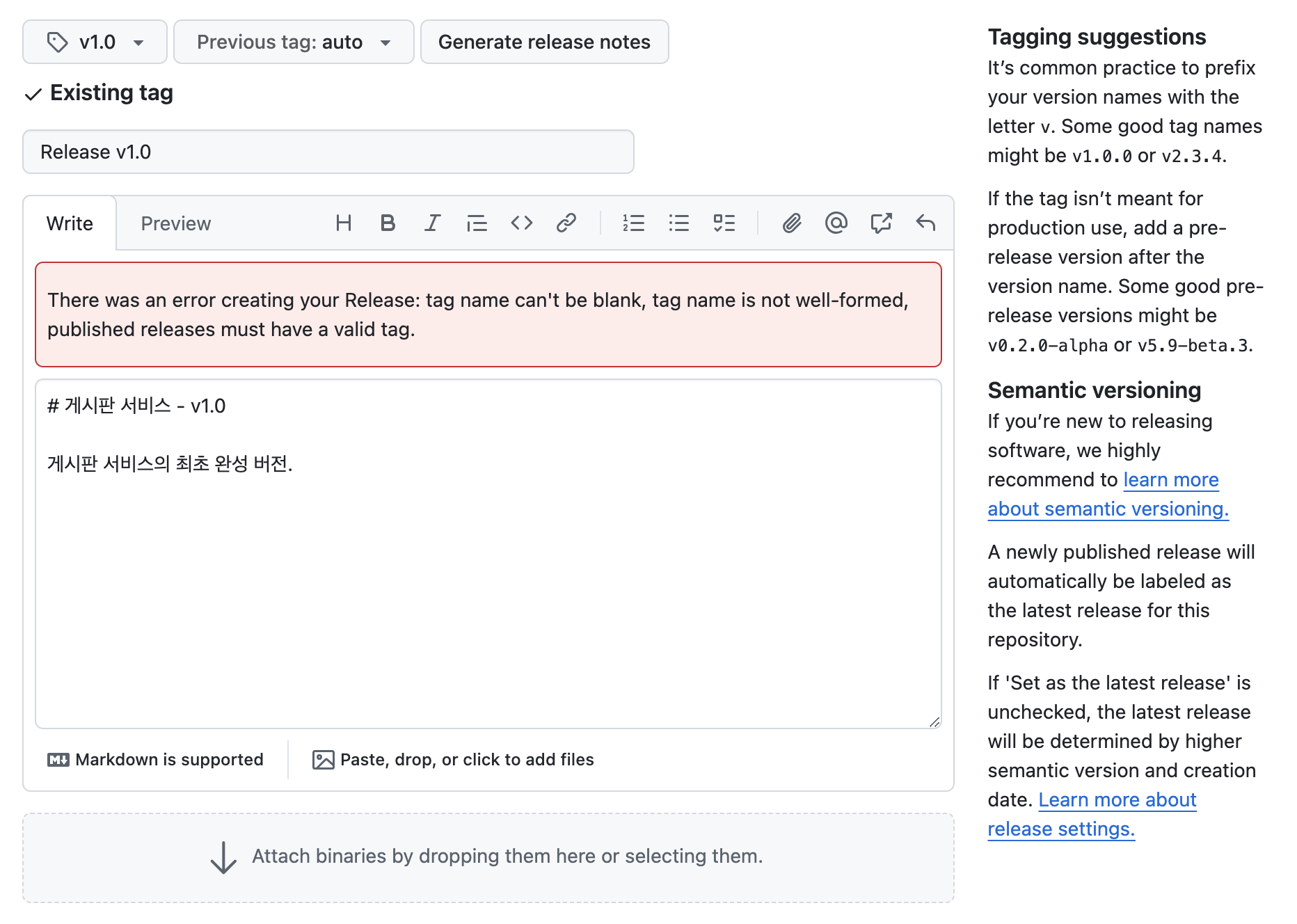 태그를 선택하지 않으면, 'There was an error createing your Release : tag name can't be blank, tag name is not well-formed, published release must have a valid tag.' 오류가 뜨기 때문에, 태그를 꼭 선택할 것