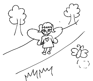 Diagonal path fairy, trees and grass, butterflies fluttering